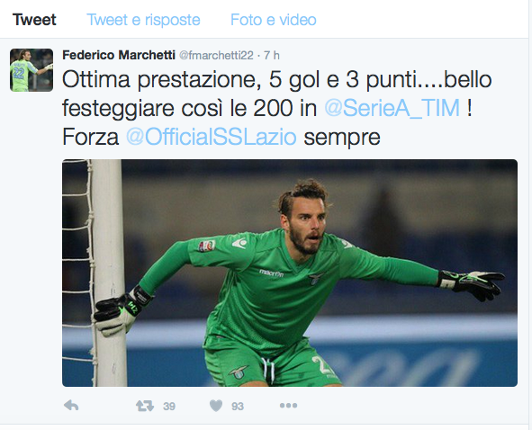 ROMA - A poche ore dalla vittoria per 5-2 sull'Hellas Verona, i giocatori della Lazio si godono il momento. Sui loro profili ufficiali condividono la loro gioia con i propri tifosi. Il primo a "twittare" il proprio entusiasmo è Stefano Mauri, ieri tornato al gol dopo una buonissima prestazione: