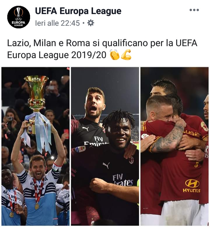 ROMA - La Lazio esce dalla stagione 2018-2019 con un ottavo posto in classifica,ma con un trofeo in più in bacheca. La Coppa Italia vinta contro l'Atalanta permette alla Lazio di disputare la prossima edizione dell'Europa League. Le altre due squadre italiane che parteciperanno alla competizione europea saranno Milan e Roma, ma i giallorossi con il sesto posto finale dovranno partire dal secondo turno preliminare, che si giocherà il 25 luglio. Su Facebook il profilo ufficiale dell'Europa League attraverso un post si complimenta con le squadre italiane qualificate alla competizione.