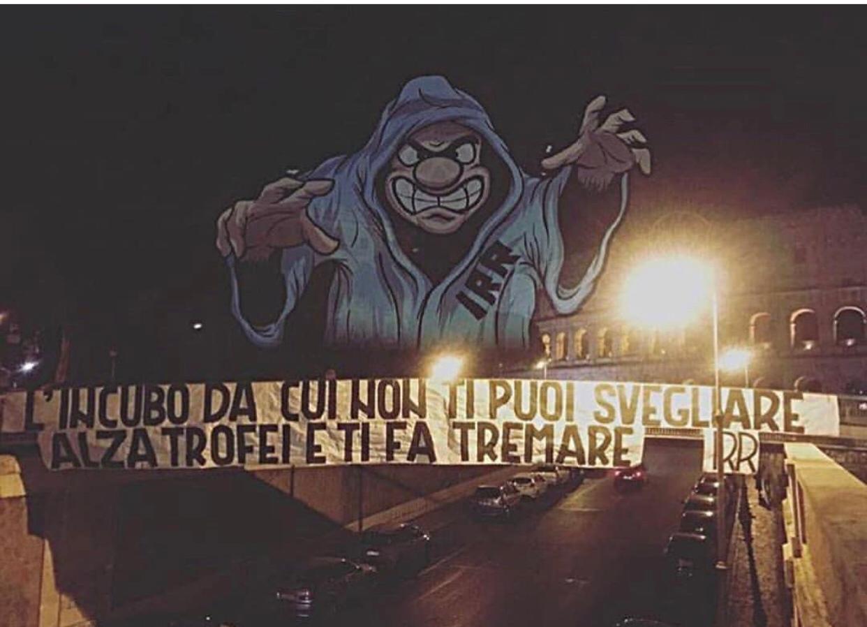 ROMA - Dopo la gara contro il Bologna, al Colosseo, è apparso un nuovo striscione dei tifosi della Lazio indirizzato a quelli della Roma. Il riferimento è al fatto che la squadra biancoceleste continua ad alzare trofei, l'ultimo è stata la Coppa Italia, mentre i 'cugini' rimangono a secco. Lo striscione rimanda alla coreografia in un derby del 2017: "Da sempre il vostro incubo peggiore" recitava, mentre nella nuova versione si legge: "L'incubo da cui non ti puoi svegliare. Alza trofei e ti fa tremare". Ecco una foto: