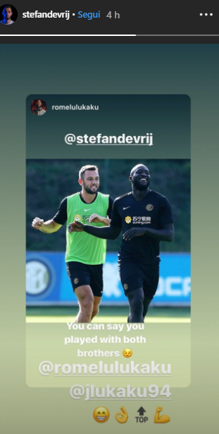 ROMA - Si vanta Romelu Lukaku, l'ex Manchester United è ringalluzzito nel mezzo dei suoi primi allenamenti con la nuova maglia e scherza con l'ex Lazio Stefan de Vrij: "Ora puoi dire di aver giocato con entrambi i fratelli" scrive il belga su Instagram. Il riferimento è ovviamente ai fratelli Lukaku, avendo de Vrij giocato anche con Jordan ai tempi della Lazio. Ecco il post: