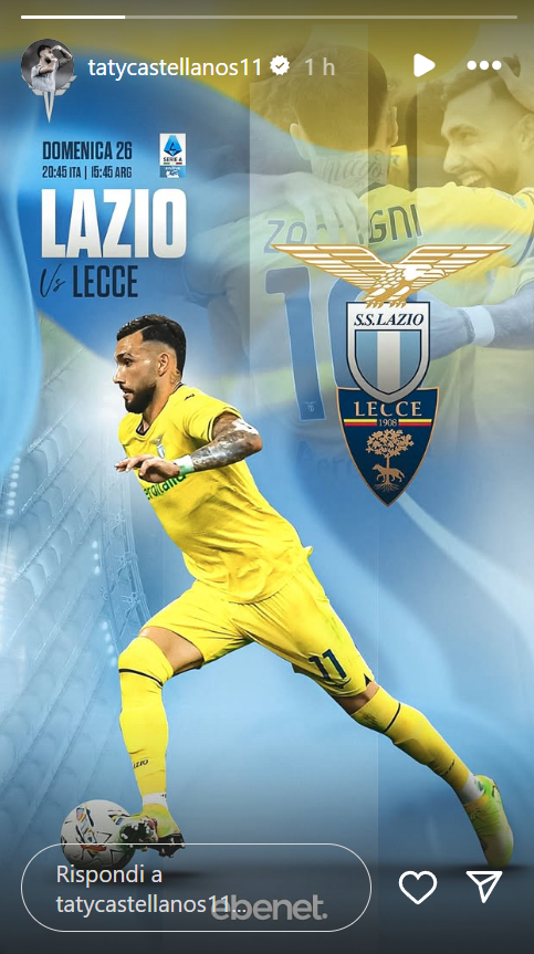Il tecnico biancoceleste spera in una prestazione d'alto livello da parte del suo reparto offensivo, a partire da Castellanos. L'argentino conosce bene l'importanza di questa gara, e vuole farsi trovare pronto nell'ultima uscita casalinga dei biancocelesti. Proprio l'attaccante ha voluto caricare squadra e ambiente biancoceleste per il match di stasera. Sui social infatti l'argentino ha pubblicato una storia su Instagram con cui ha ribadito l'importanza la gara contro i giallorossi. Di seguito la storia Instagram dell'attaccante biancoceleste.