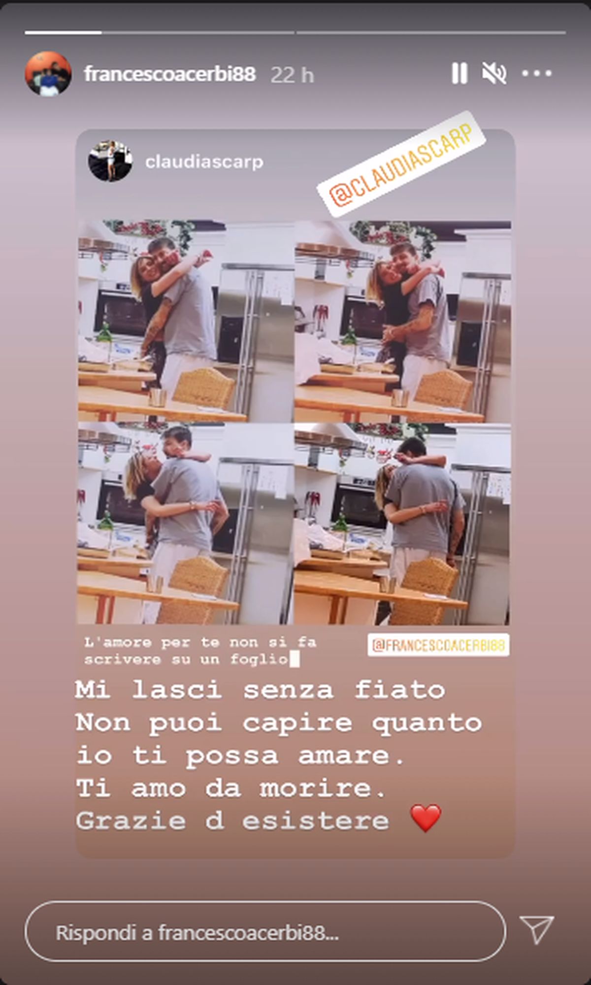 ROMA - Durante la quarantena di marzo, in cui anche il campionato era fermo e i giocatori chiusi in casa, Francesco Acerbi ogni tanto si concedeva alcune dirette social per farsi tenere compagnia. Come lui stesso ha dichiarato, la famiglia era lontana e la solitudine si faceva sentire. Adesso il Leone biancoceleste non è più solo visto che ha trovato una compagna di cui si è innamorato. Claudia Scarpari è sempre nei suoi pensieri, basterebbe rivedere alcuni post partita per rendersi conto di quanto il difensore abbia perso la testa. Di recente la compagna del centrale della Lazio ha condiviso una storia su Instagram in cui ha dichiarato tutta la sua passione verso Ace: "Mi lasci senza fiato, non puoi capire quanto io ti possa amare. Ti amo da morire, grazie di esistere". E intanto, parlando del mercato della Lazio, arrivano grosse indiscrezioni: "9 trattative possibili a gennaio!" >>> LEGGI SUBITO LA NOTIZIA
