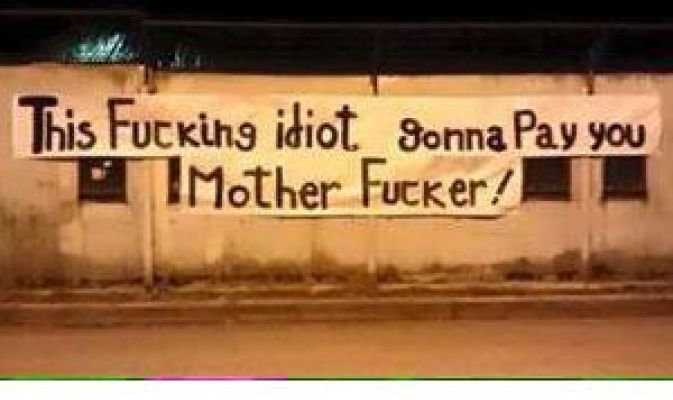 (ANSA) - ROMA, 13 APR - "This f.. idiot gonna pay you, mother f...!". Questo lo striscione esposto a Trigoria da alcuni tifosi della Roma in risposta alle dure parole del presidente Pallotta dopo la squalifica della Curva Sud dell'Olimpico per le scritte offensive per la madre di Ciro Esposito esposte nella gara col Napoli. La società giallorossa non ha fatto ricorso contro la sanzione. Anche ieri a Torino i tifosi romanisti in trasferta avevano palesato il malcontento per la presa di posizione del presidente.
