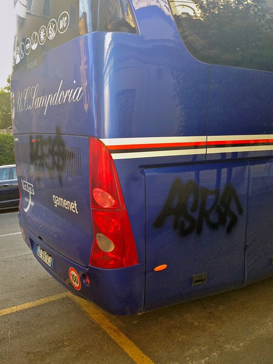 FLASH - Oggi in campo Lazio e Sampdoria. Ma sulla pagina facebook ufficiale della società blucerchiata, almeno per un attimo, non si parla del match, non si parla di calcio. Come documentato dalla stessa società, nella notte alcuni vandali hanno imbrattato il pullman della squadra parcheggiato all'esterno dell'hotel in zona Parioli. Nella foto (in basso) si notano bene delle svastiche accompagnate dalla sigla ASR.