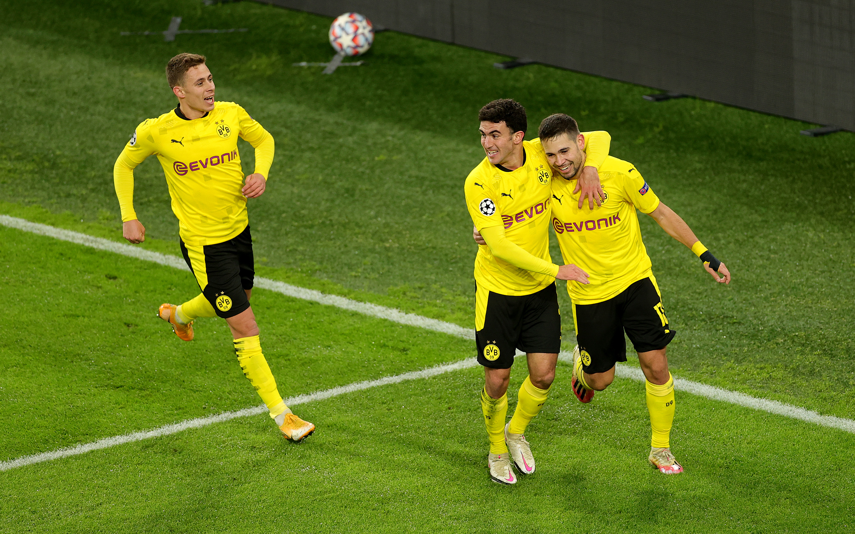 DORTMUND, GERMANY - DECEMBER 02: Raphael Guerreiro of Borussia Dortmund celebrates with teammate Mateu Morey after scoring their team's first goal during the UEFA Champions League Group F stage match between Borussia Dortmund and SS Lazio at Signal Iduna Park on December 02, 2020 in Dortmund, Germany. Sporting stadiums around Germany remain under strict restrictions due to the Coronavirus Pandemic as Government social distancing laws prohibit fans inside venues resulting in games being played behind closed doors. (Photo by Friedemann Vogel - Pool/Getty Images)