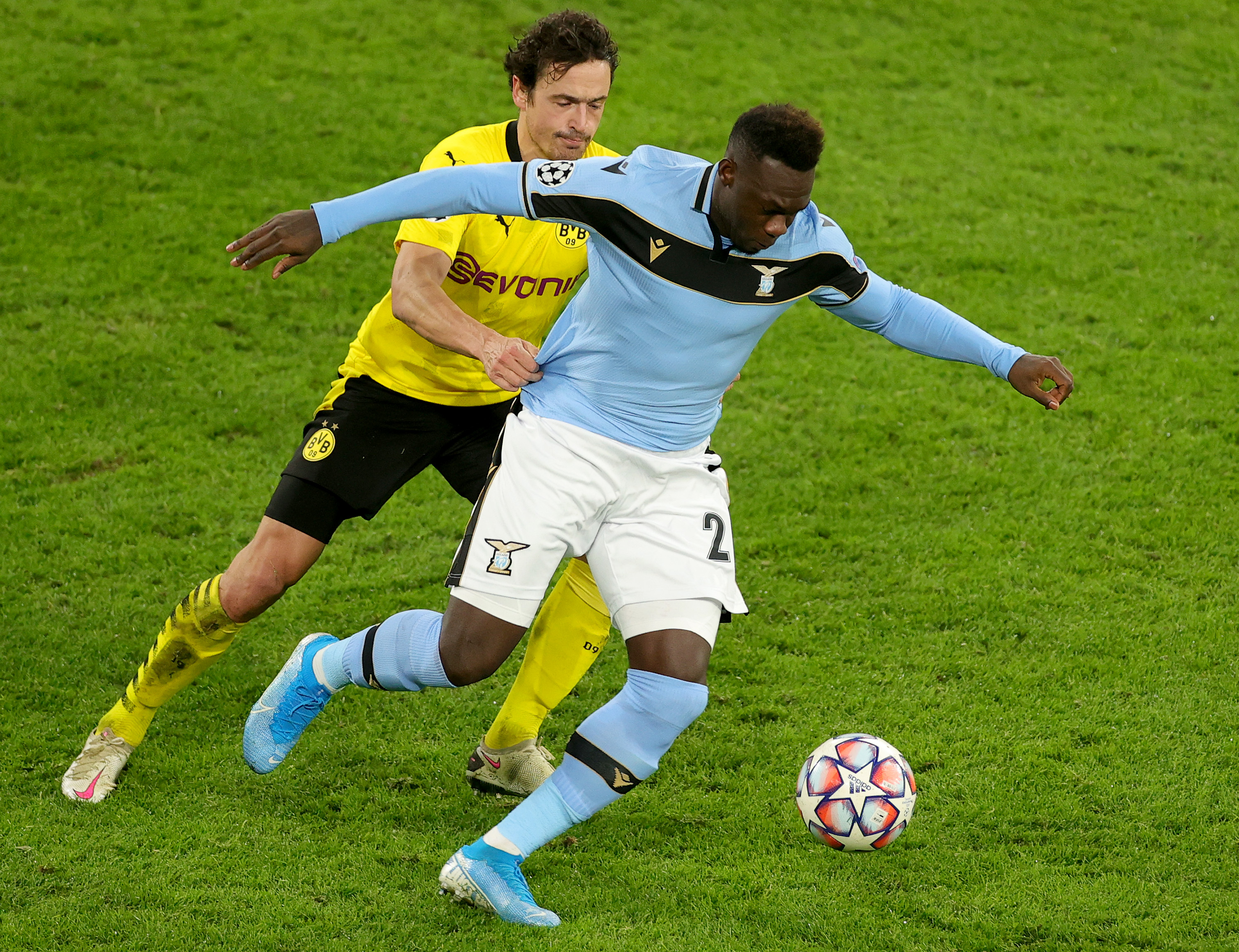 DORTMUND, GERMANY - DECEMBER 02: Mateu Morey of Borussia Dortmund competes for the ball with Mohamed Fares of SS Lazio during the UEFA Champions League Group F stage match between Borussia Dortmund and SS Lazio at Signal Iduna Park on December 02, 2020 in Dortmund, Germany. (Photo by Marco Rosi - SS Lazio/Getty Images)