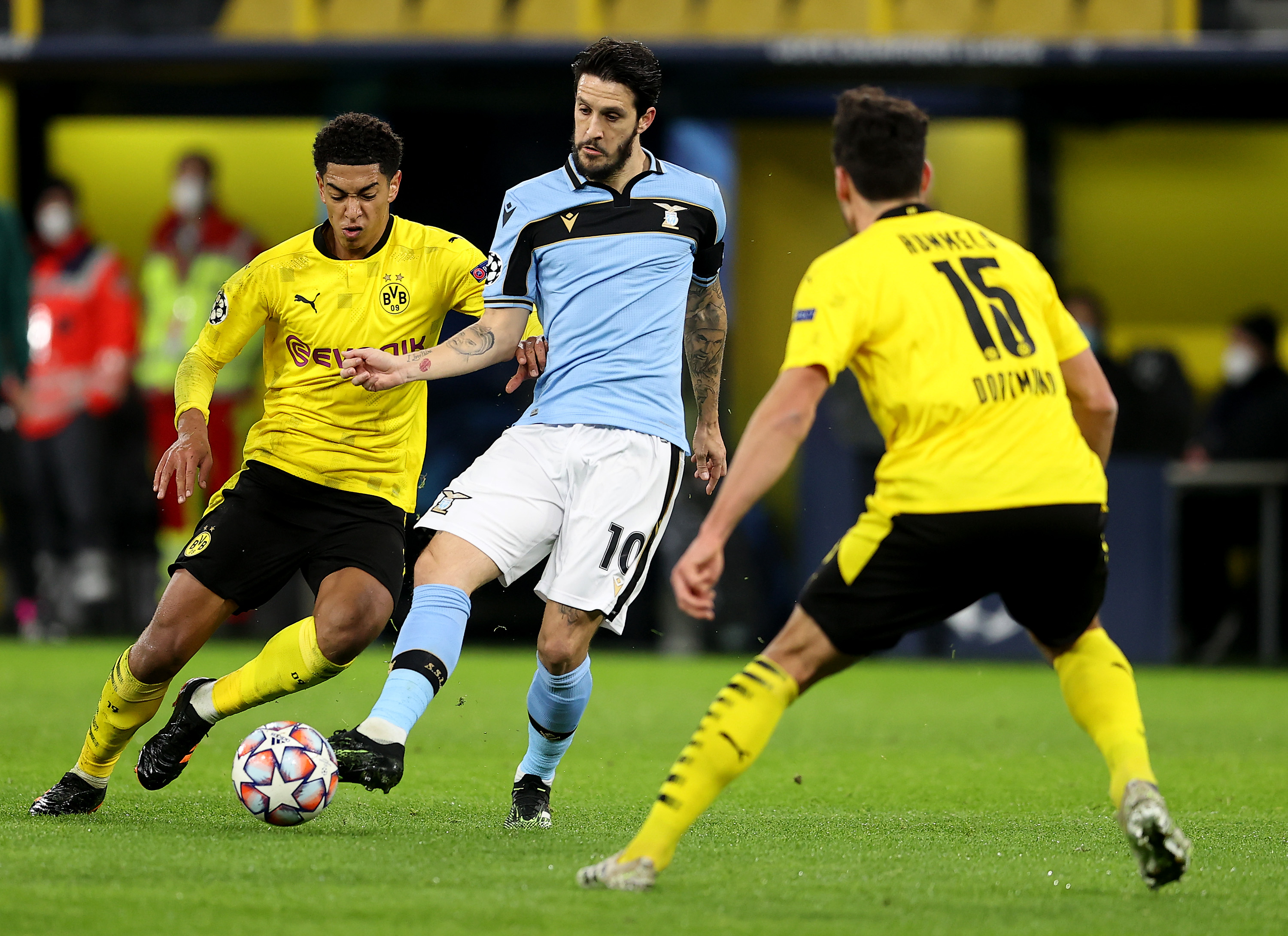 DORTMUND, GERMANY - DECEMBER 02: Jude Bellingham of Borussia Dortmund looks to break past Luis Alberto of Lazio during the UEFA Champions League Group F stage match between Borussia Dortmund and SS Lazio at Signal Iduna Park on December 02, 2020 in Dortmund, Germany. Sporting stadiums around Germany remain under strict restrictions due to the Coronavirus Pandemic as Government social distancing laws prohibit fans inside venues resulting in games being played behind closed doors. (Photo by Lars Baron/Getty Images)