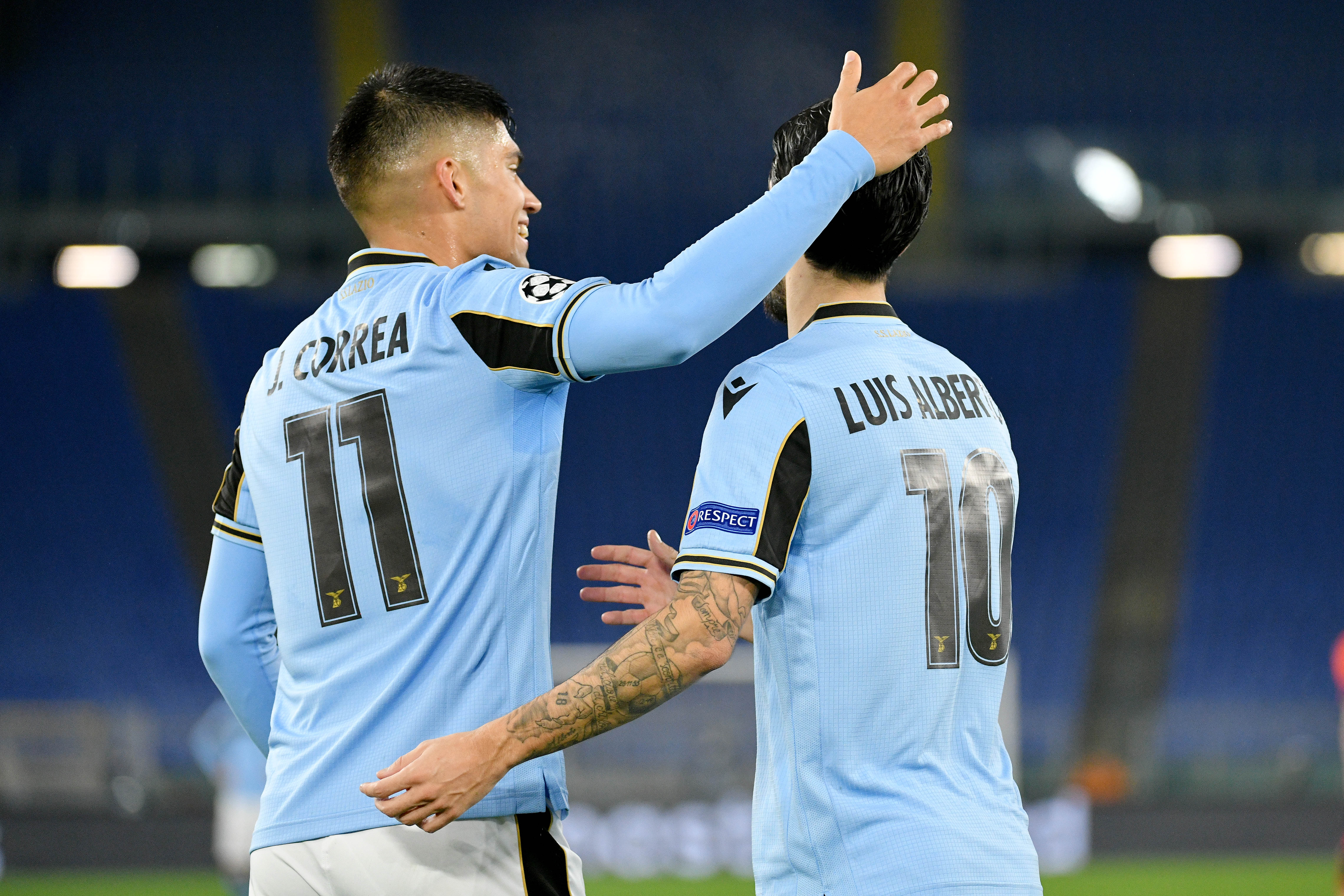 ROME, ITALY - DECEMBER 08: Joaquin Correa of SS Lazio celebrates with teammate Lucas Leiva of SS Lazio after scoring their team's first goal during the UEFA Champions League Group F stage match between SS Lazio and Club Brugge KV at Stadio Olimpico on December 08, 2020 in Rome, Italy. Sporting stadiums around Italy remain under strict restrictions due to the Coronavirus Pandemic as Government social distancing laws prohibit fans inside venues resulting in games being played behind closed doors. (Photo by Paolo Bruno/Getty Images)