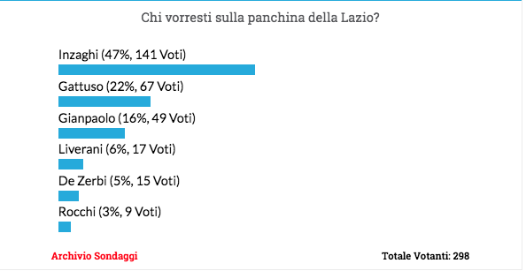 ROMA - Vi abbiamo chiesto di esprimere la vostra preferenza su chi vorreste sulla panchina biancoceleste. Tra le opzioni, ovviamente, abbiamo lasciato anche l'attuale tecnico della Lazio, Simone Inzaghi. I lettori di Cittaceleste sembrano avere pareri diversi. La maggioranza ha dato ancora fiducia ad Inzaghi, qualcun altro, invece, non sembra affatto scartare l'ipotesi Gattuso e Gianpaolo. Ecco come vi siete espressi votando il nostro sondaggio.