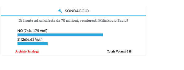 Su tale argomento, vi abbiamo chiesto di esprimervi rispondendo al nostro semplice sondaggio "Vendereste Milinkovic di fronte ad offerte da almeno 70 milioni'". I lettori di Cittaceleste hanno risposto così
