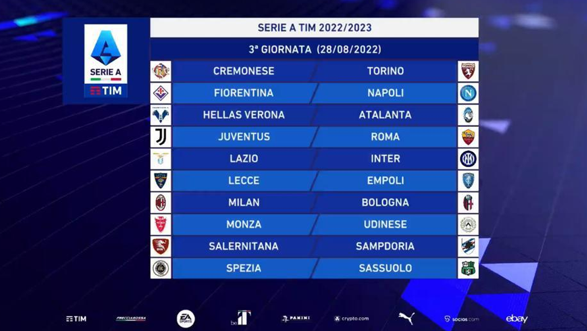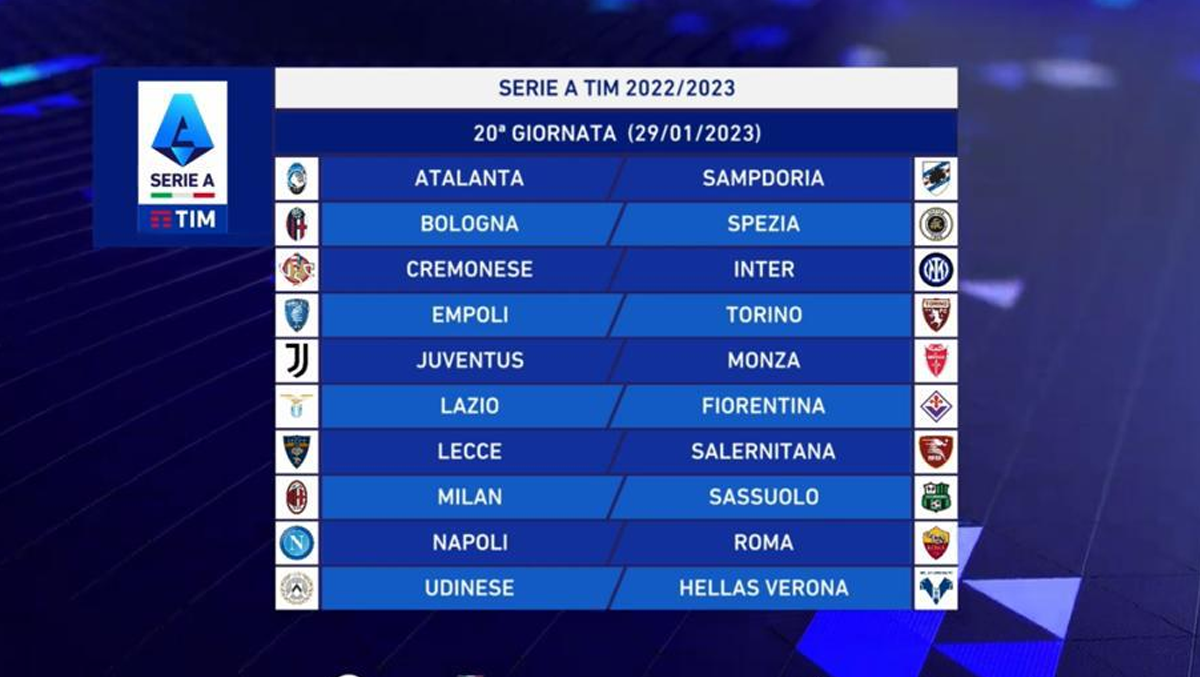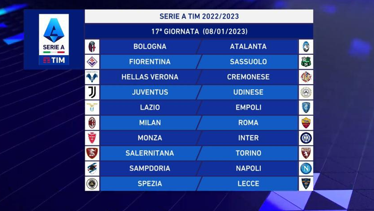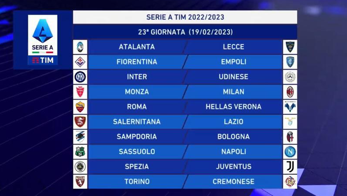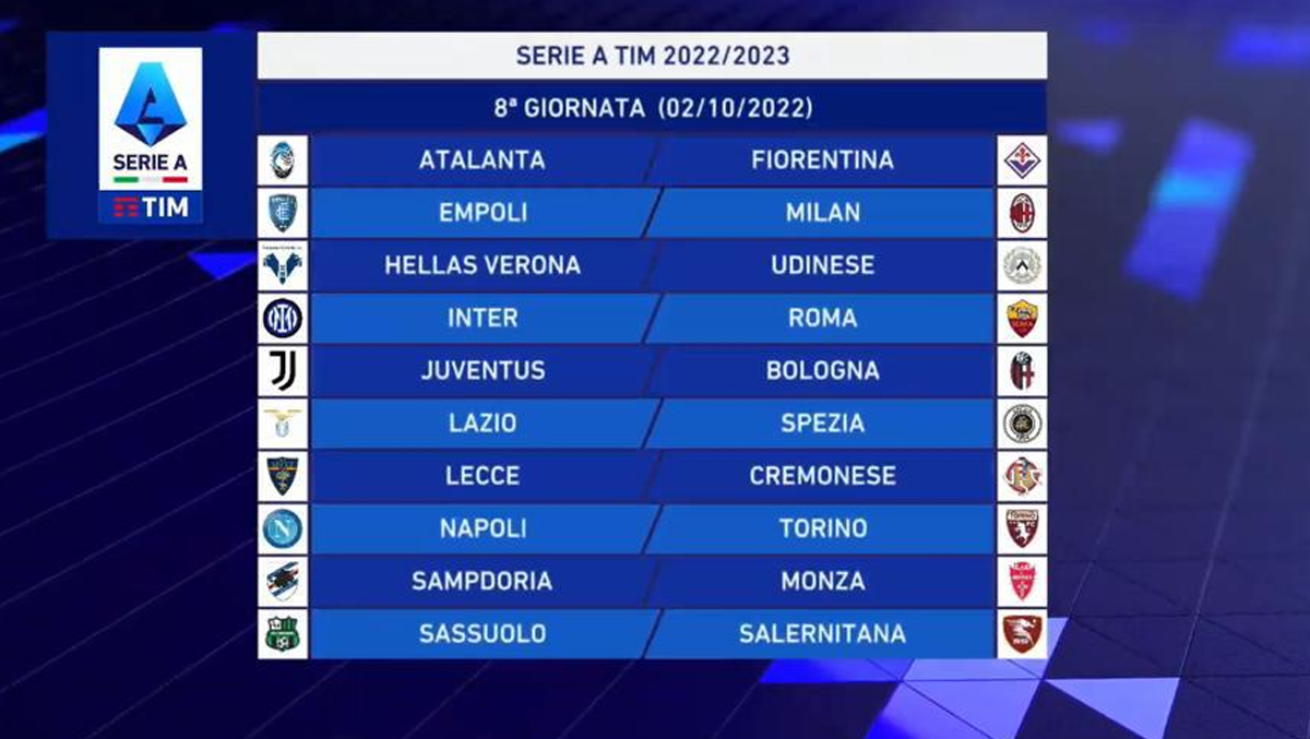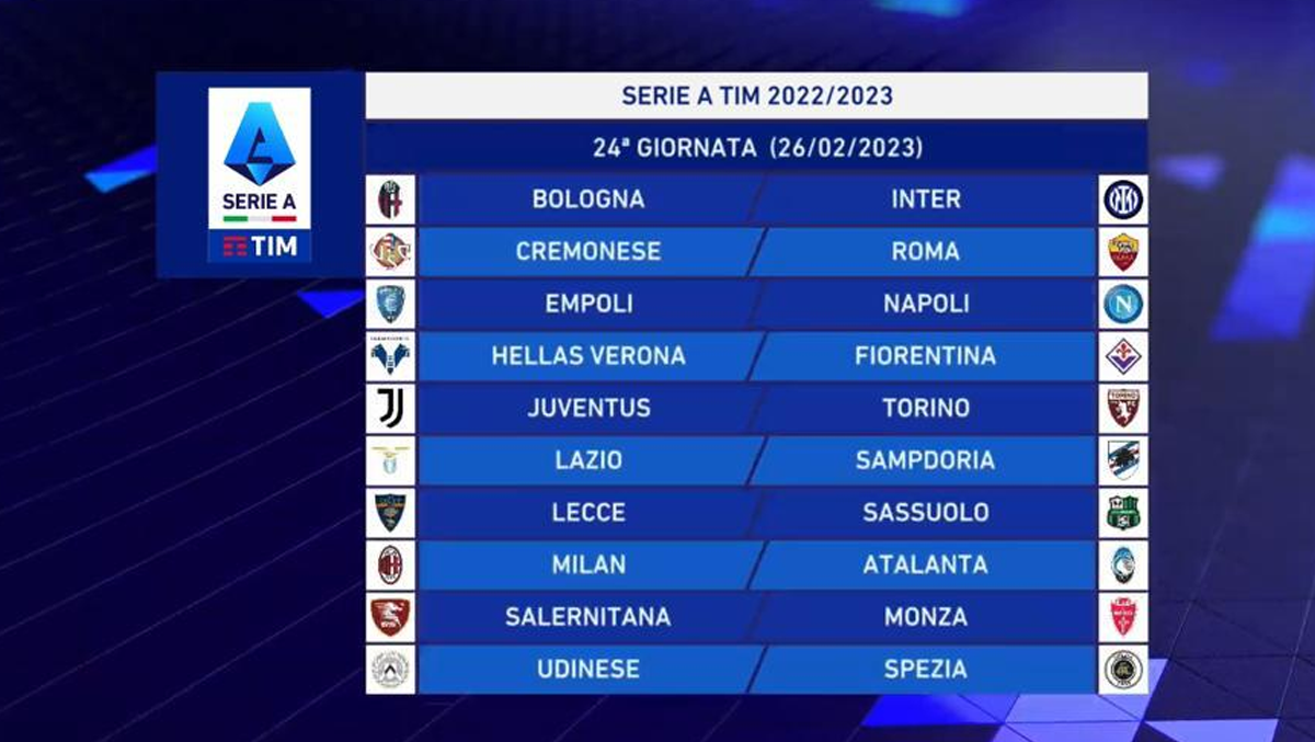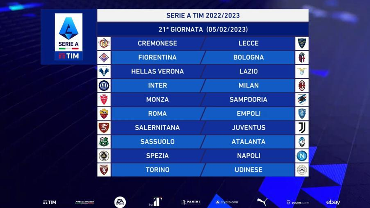 - è prevista alternanza assoluta degli incontri in casa ed in trasferta per le seguenti coppie di Società: Empoli-Fiorentina, Inter-Milan, Juventus-Torino, Lazio-Roma, Napoli-Salernitana.