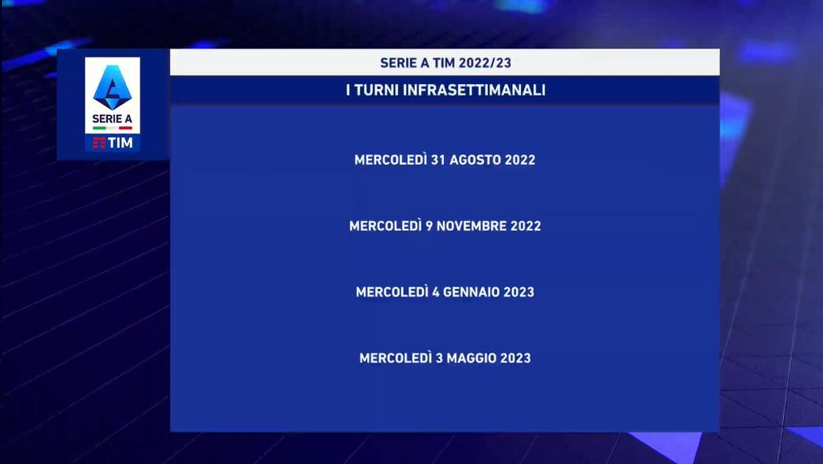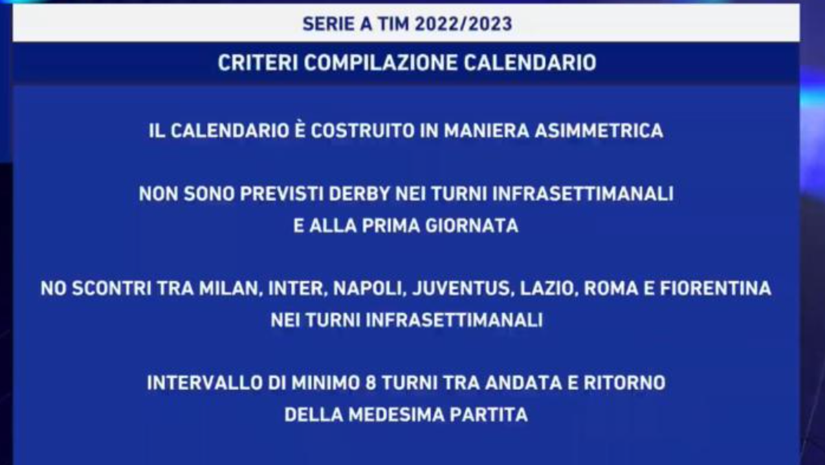 “Il calendario della Serie A TIM 2022-2023 sarà presentato domani, 24 giugno, alle ore 12.00. Le giornate che comporranno la prossima stagione saranno svelate in diretta su Dazn e sul canale YouTube di Lega Serie A. Di seguito i vincoli e i criteri che saranno rispettati nella compilazione del calendario della Serie A TIM, che anche in questa stagione presenterà le partite del girone di ritorno in ordine diverso, sia come sequenza, sia come composizione all’interno di una giornata, rispetto all’andata: