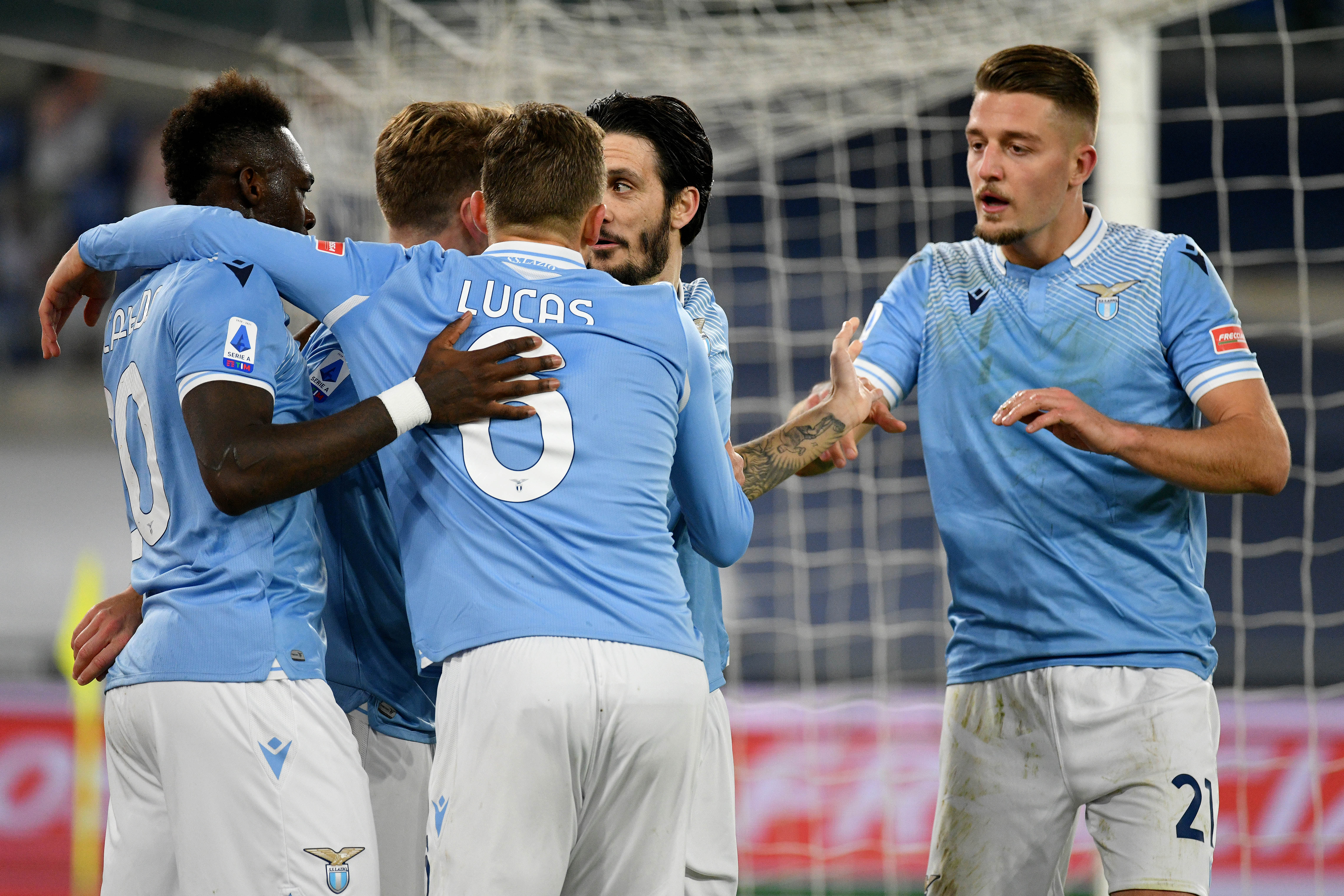 ROME, ITALY - JANUARY 15: Luis Alberto of SS Lazio celebrate a second goal with his team mates during the Serie A match between SS Lazio and AS Roma at Stadio Olimpico on January 15, 2021 in Rome, Italy. (Photo by Marco Rosi - SS Lazio/Getty Images)