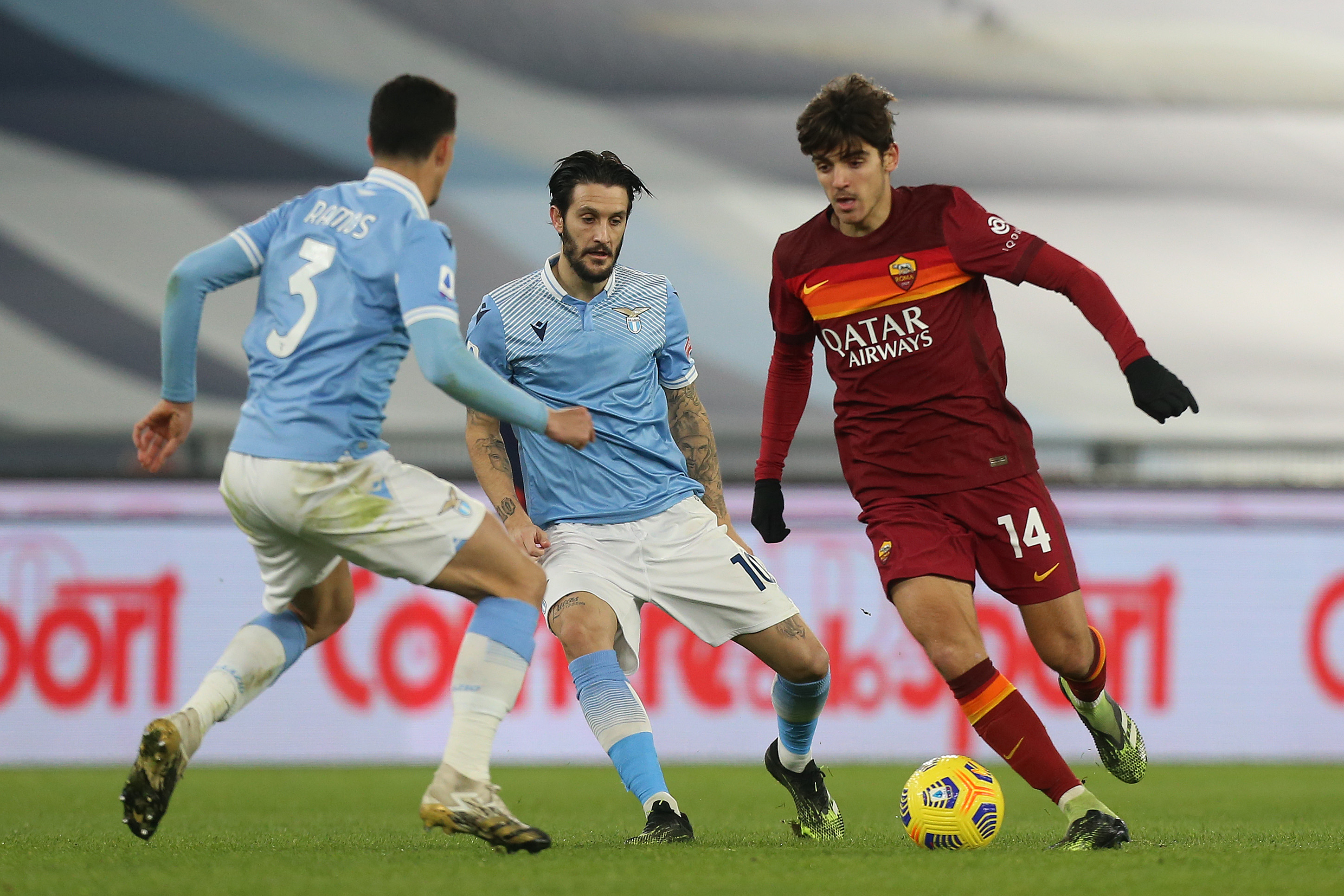 ROME, ITALY - JANUARY 15: Gonzalo Villar of Roma is challenged by Luiz Felipe and Luis Alberto of Lazio during the Serie A match between SS Lazio and AS Roma at Stadio Olimpico on January 15, 2021 in Rome, Italy. (Photo by Paolo Bruno/Getty Images)