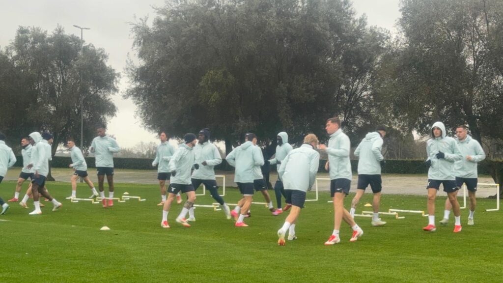 Inizia la rifinitura di Lazio-Viktoria Plzen, attivazione muscolare per i calciatori biancocelesti ed esercizi con il pallone per i portieri